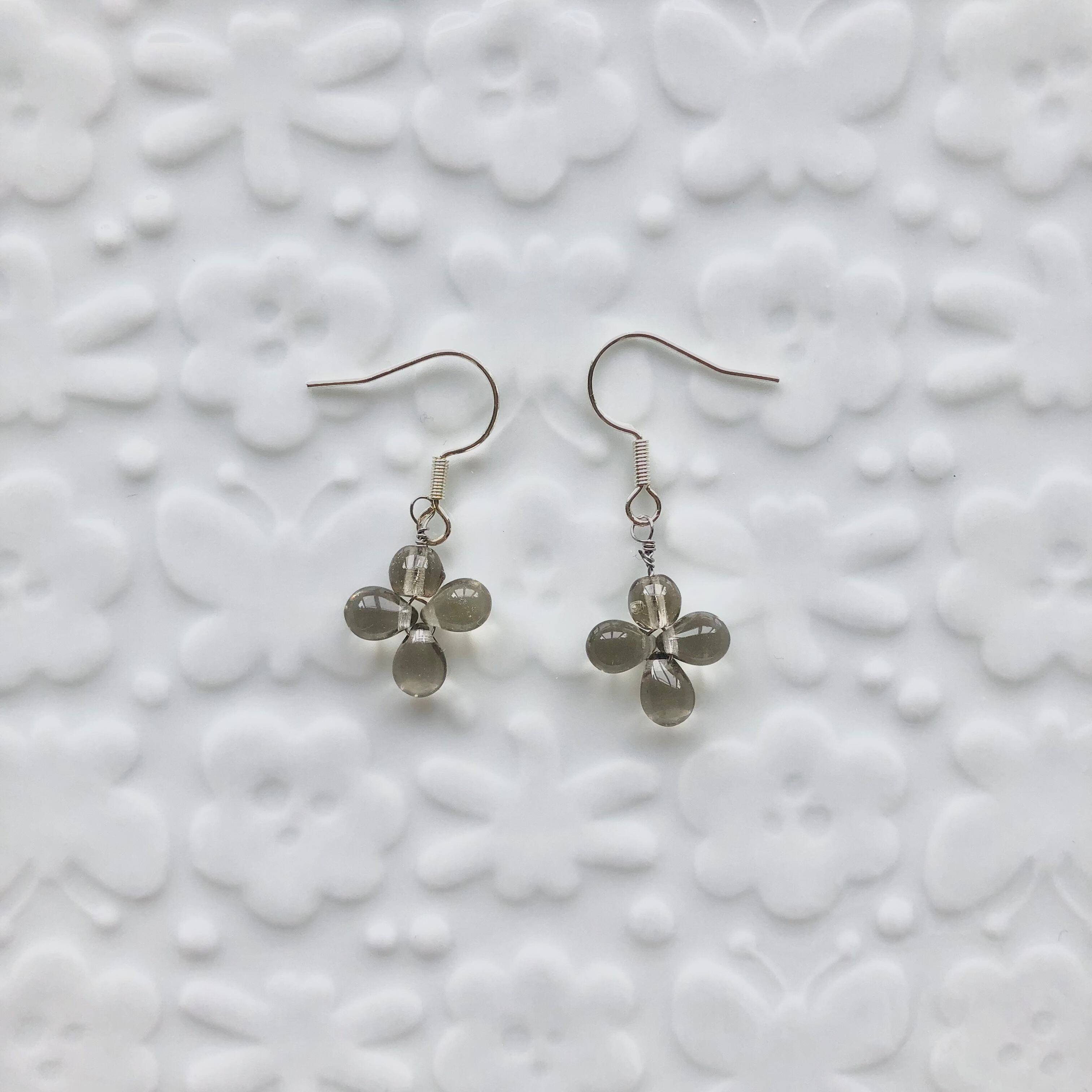 グレーのガラスビーズを使用したクロス型のピアスです